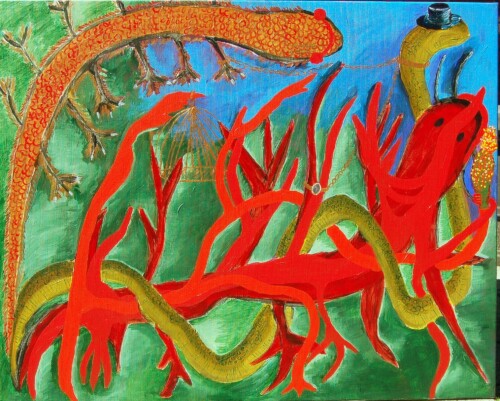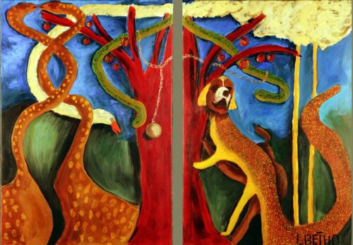 One series exists of 8 or 10 paintings, and the next one evolves from the previous one, It is not something I decide, but it happens most of the time after I have dreamed about my next series.