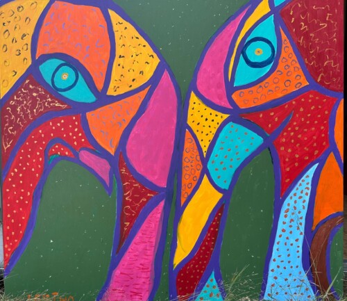 Animals take center stage in her paintings—not as realistic depictions, but as imagined beings born from her inner world. These creatures emerge from a dreamlike realm, vivid and full of spirit.