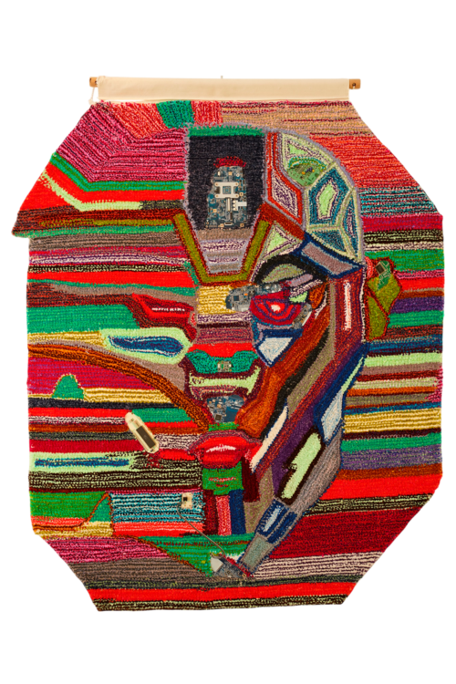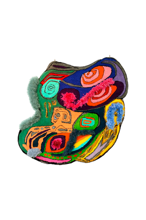 His current body of work is centered on handwoven wool tapestries. Fascinated by the act of weaving as both a literal and symbolic gesture, Pondev uses the loom as a tool to interlace memory, identity, and global concerns into vibrant, textured compositions.