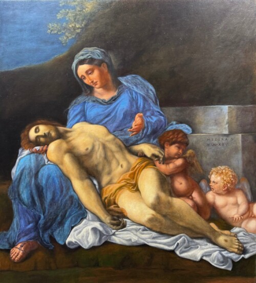Sanda Mezéka is a Swiss artist whose work blends mystical realism, sacred geometry, and the techniques of the Old Masters. She holds a Master’s in Sacred Art from the Scuola di Arte Sacra in Florence and a BFA from Herzen University in St. Petersburg. Her formation includes studies at the Florence and Barcelona Art Academies and The Prince’s Foundation in London, as well as private training with Gianpaolo Tomassetti, Tatyana Kuznetsova, Georges Kordis, Koo Schadler and other masters. She has exhibited internationally.