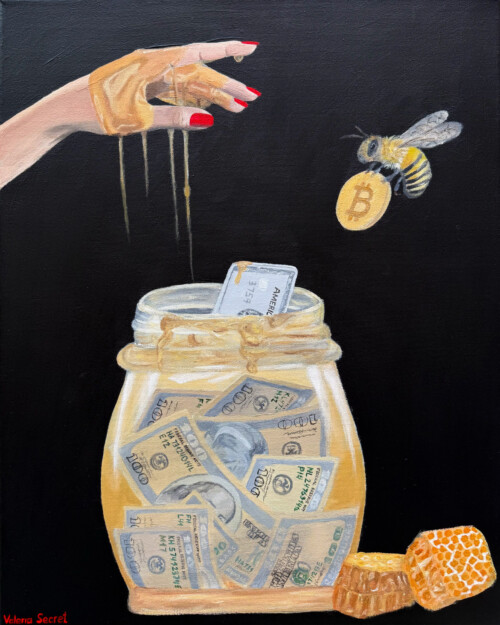 Valeria Secret is a self-taught artist whose work blurs the line between fantasy and reality. With realistic figures, vivid color palettes, and surreal compositions, she creates immersive scenes where luxury, fashion, nature, and modern symbolism collide. Her work seduces at first glance but beneath the gloss lies irony, social commentary, and layers of metaphor.