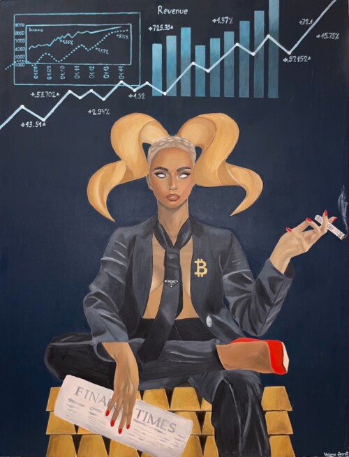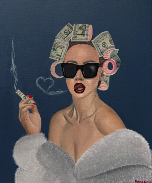 The thin line between reality and fantasy is often blurred in Valeria’s artworks. With vibrant and vivid colors, she paints realistic human forms and worlds where natural beauty, luxury items, high fashion, and wildlife mingle without a fundamental loss of identity. Hers is contemporary magical realism, an oxymoron characterized by a juxtaposition of different worlds and things, by the meticulous and unusual arrangement of details that make the real-world setting unfamiliar, uncanny, and beyond reality. Valeria´s artworks touch on many different and various specific topics and she expresses the satire and irony of modern society in a fun and philosophical way. Valeria often resorts to self-portraits which helps to emphasize the sarcasm even more. She wants to immerse the audience in the world of luxury while showing its vicious side. Her aim is to make people find their own meaning in her artworks so she only gives hints using metaphors which makes her artworks bold and mysterious.