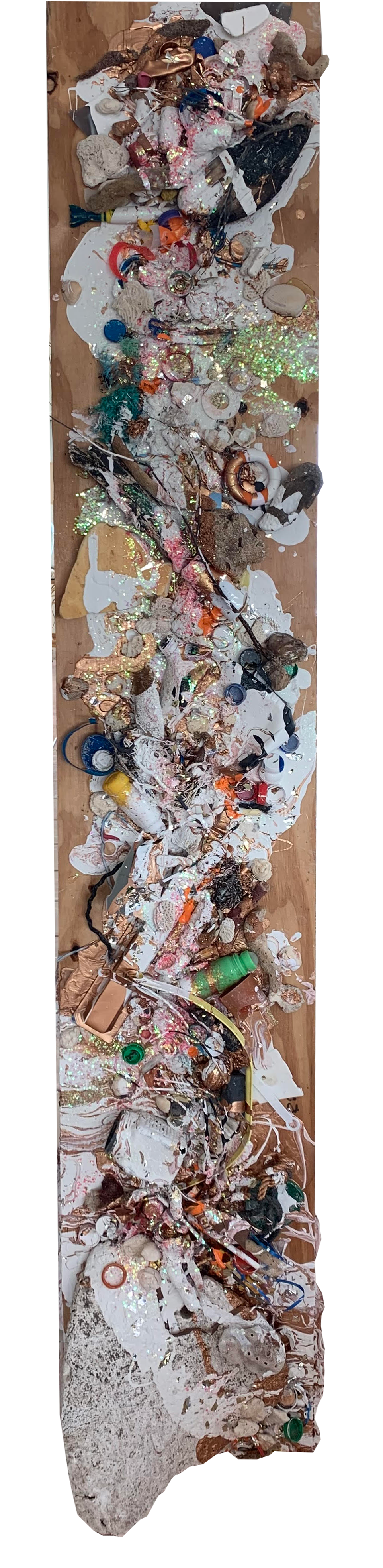 Materials Ocean trash, decorative paint and glitter on paper