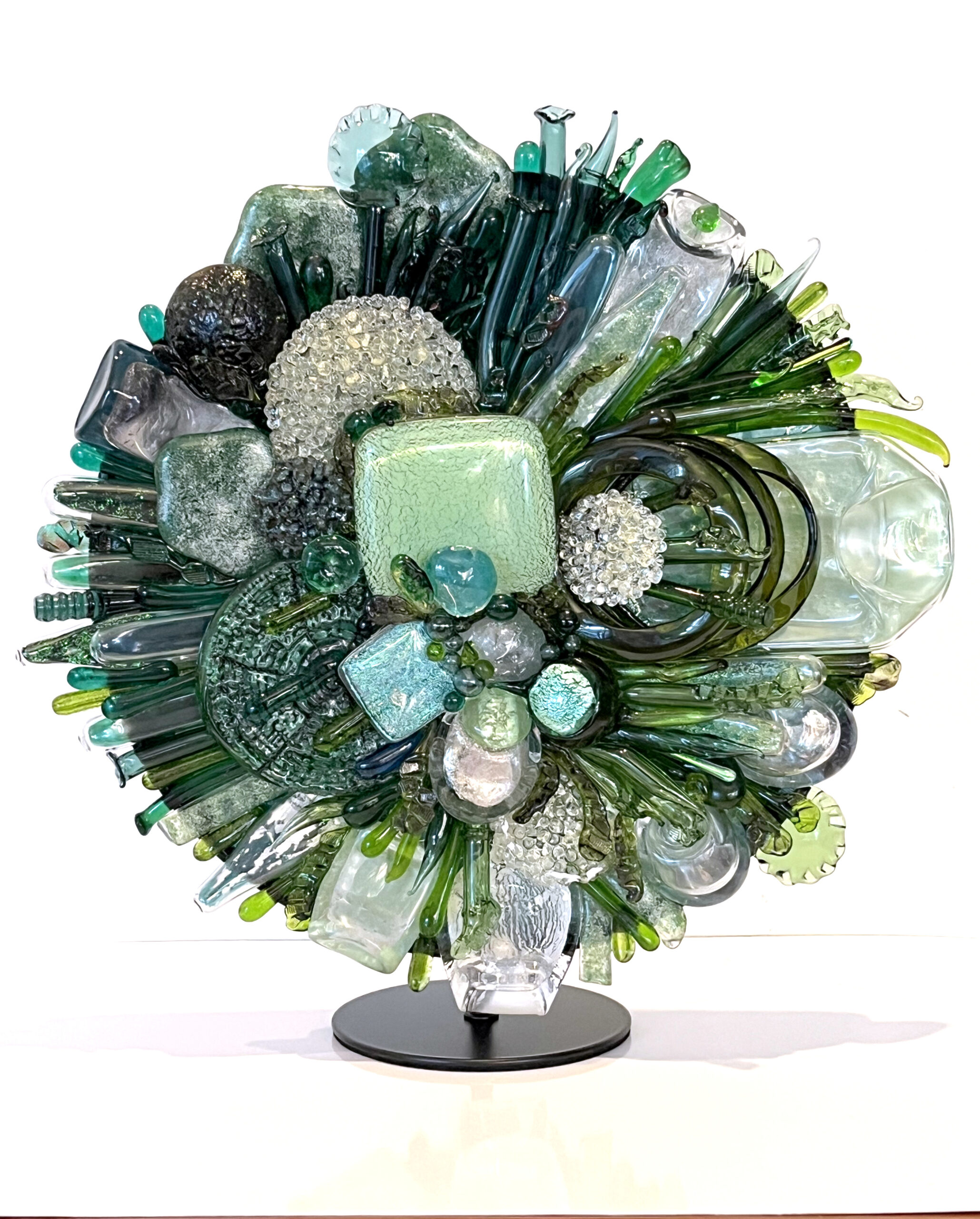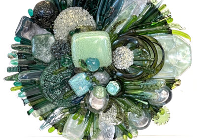 Janine Altman. Técnica: Trabajo con soplete y vidrio fundido en horno, vidrio Bullseye, float y especialmente vidrio reciclado. 29 x 26 x 11 cm U$S 3.600