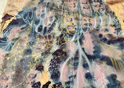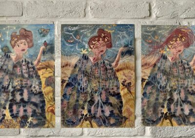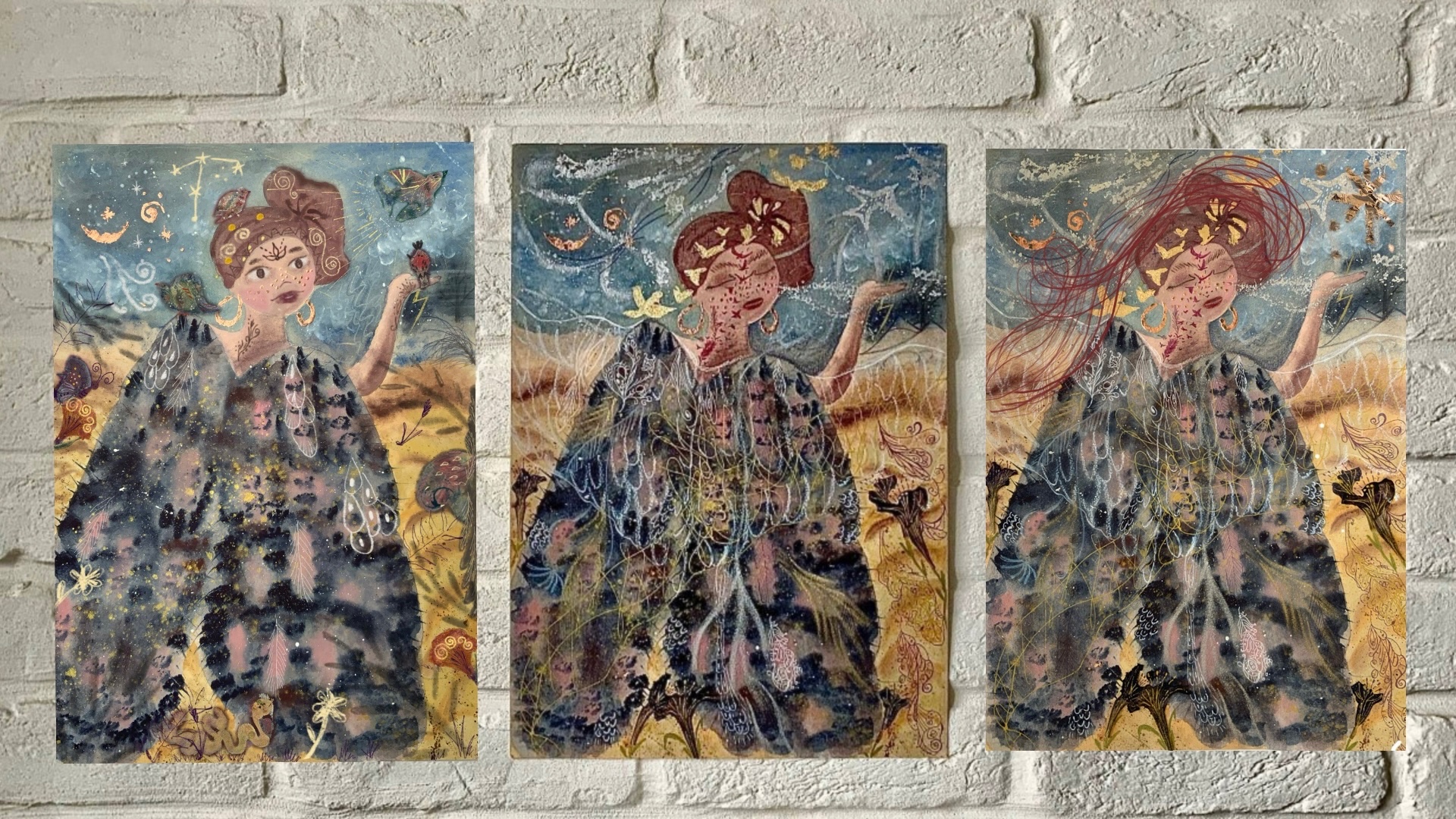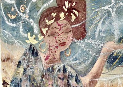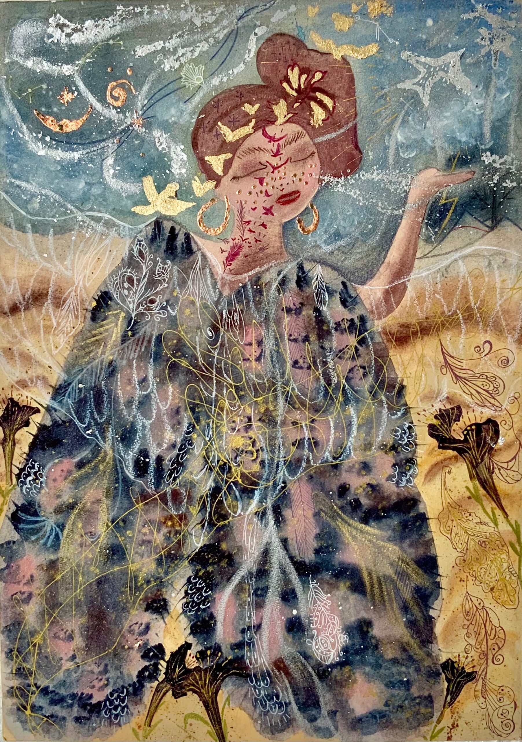 Materials Aquarelle, acryl, ink, golden metallic foil, crayons, pens.