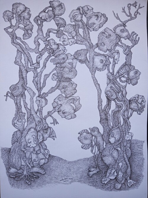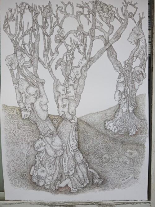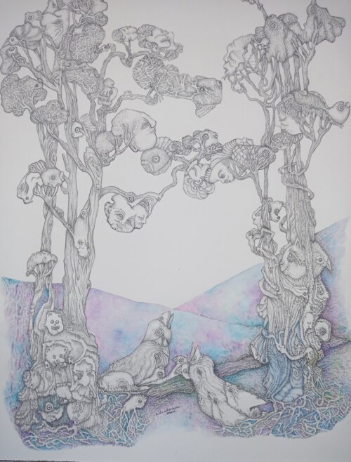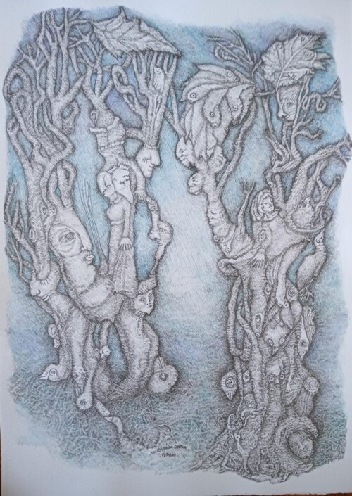 Mis obras proponen un territorio liminal entre lo humano, lo animal y lo vegetal, donde las formas del bosque se transforman en cuerpos y rostros que habitan la corteza de los