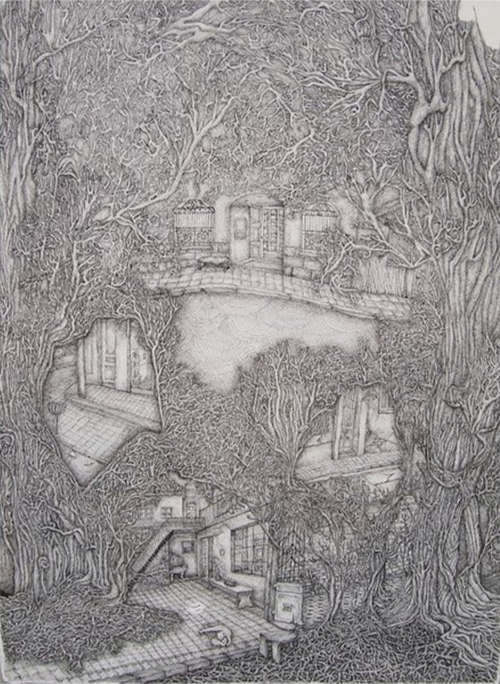 El dibujo funciona como un mapa de interconexiones: cada línea revela la presencia de seres híbridos que emergen y se ocultan, sugiriendo que la naturaleza guarda la huella