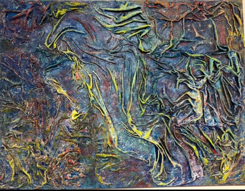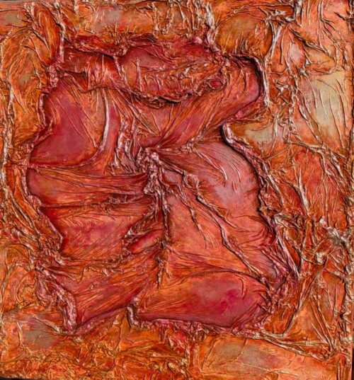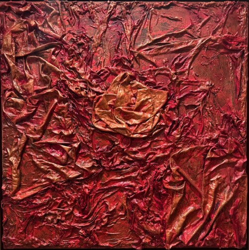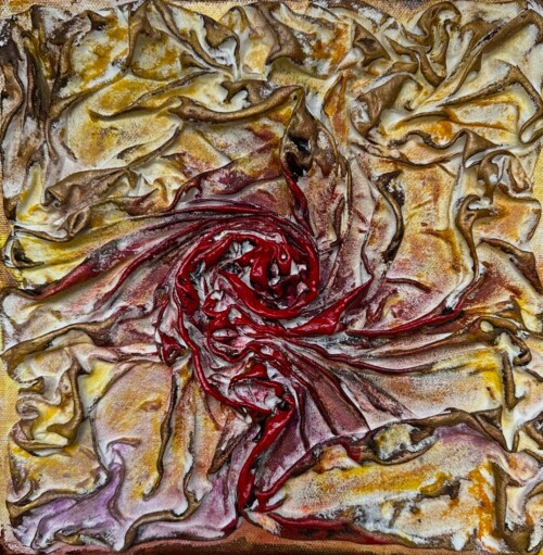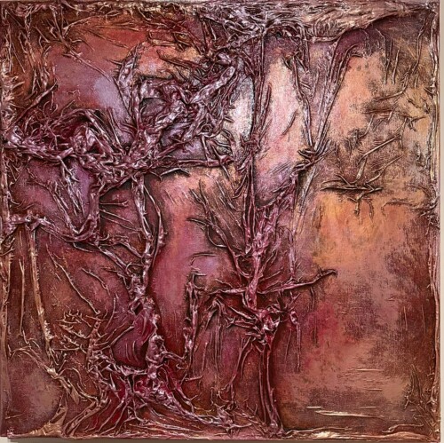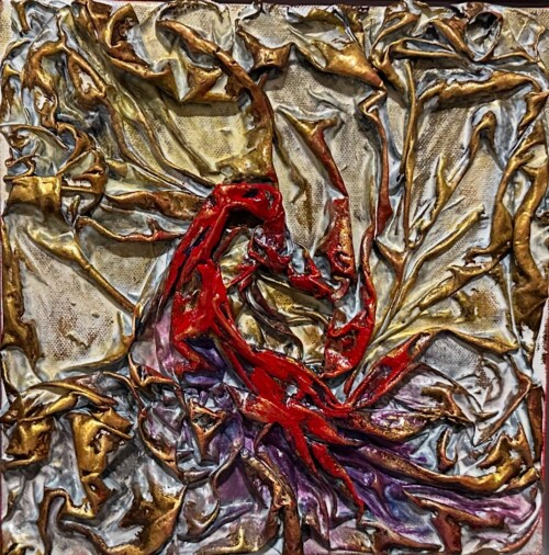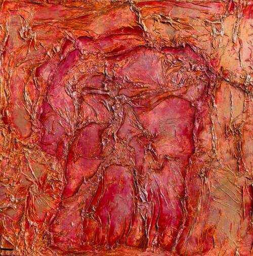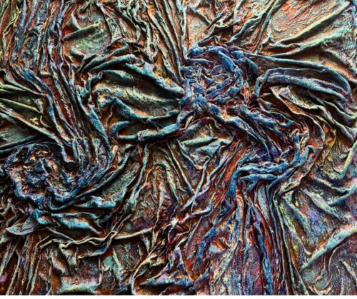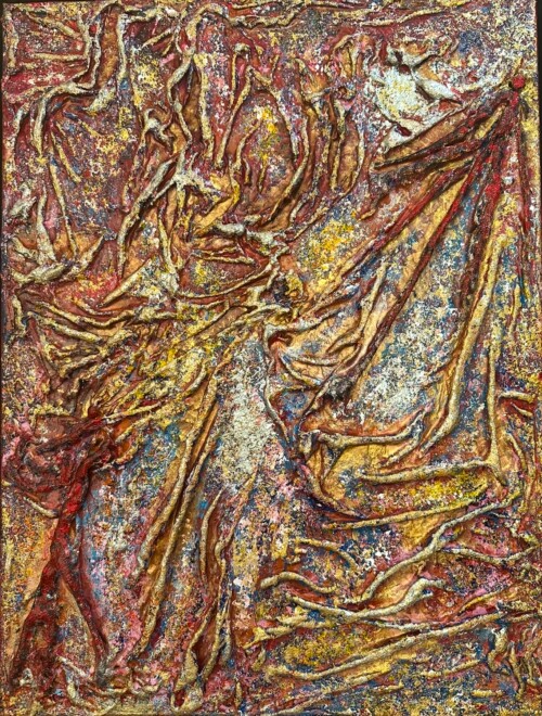 Her work is often compared to the haunting energy of Dante Alighieri’s infernal visions, with figures emerging from chaos, yearning for light and transformation. Using rich pigments and flowing silk, Maria’s process is intuitive and embodied—guided by feeling rather than form. Each piece invites the viewer into a space of emotional resonance, where beauty and pain coexist.