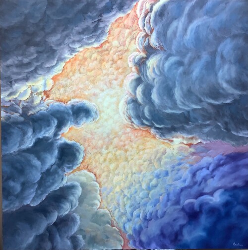Nella mia pittura indago il tema del cielo e della luce come spazi di immaginazione e contemplazione. Attraverso nuvole, presenze sospese e cromatismi fluidi cerco di restituire la sensazione di grandi profondità in spazi immensi, evidenziando il movimento dell’aria e costruendo ampi effetti prospettici che ampliano lo sguardo e lo spazio percepito.
