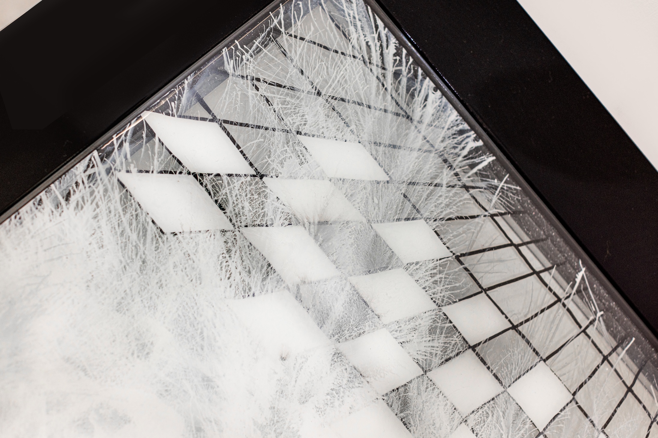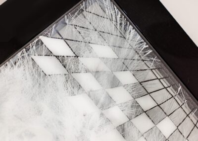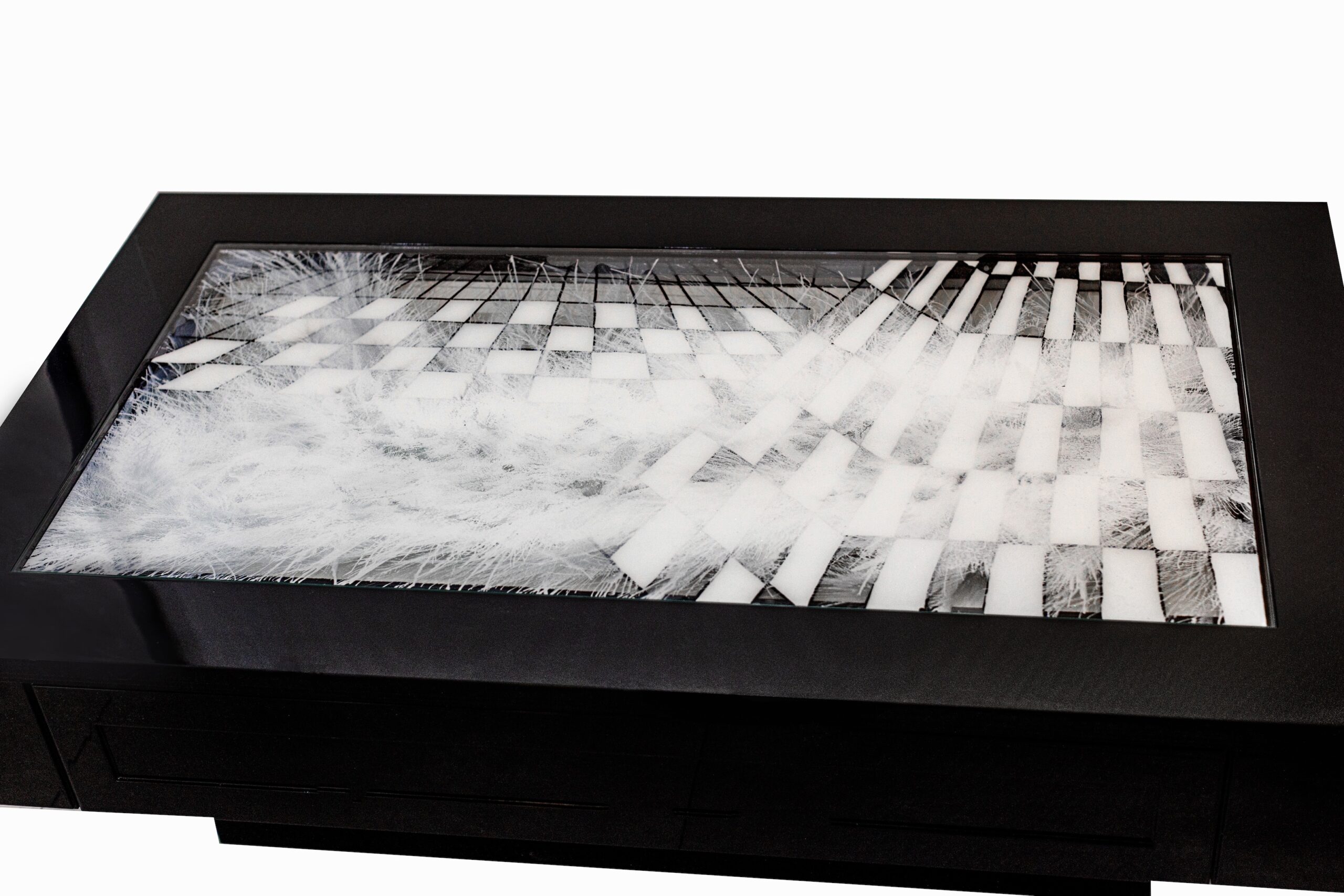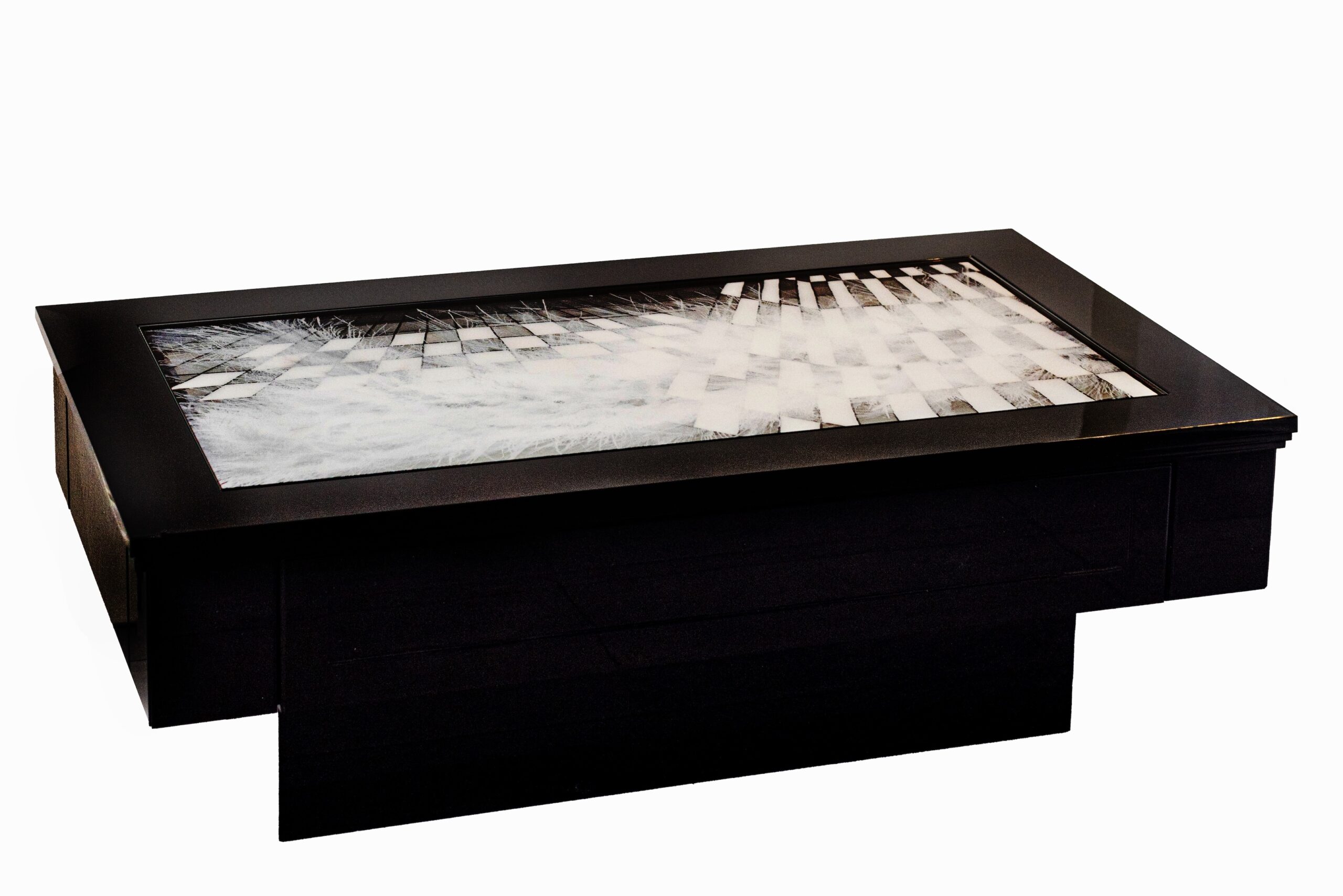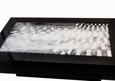 Materials Mixed Technique on Plexi Glass with LED & covered with Epoxy, Processed in the wooden table in piano lacquer