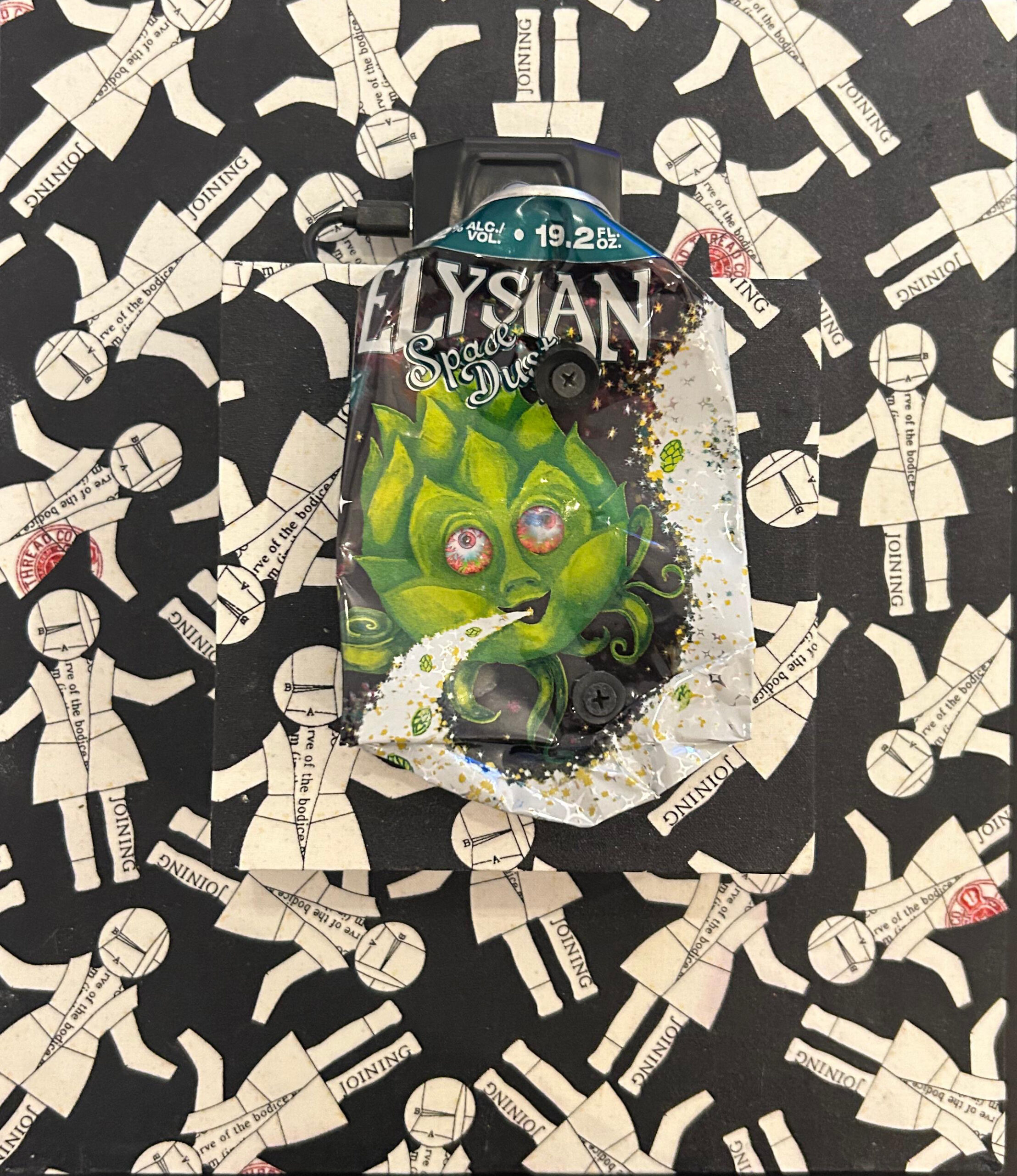Materials Fabric on wood, found objects, acrylic paint, motion detectors with recorded original sound