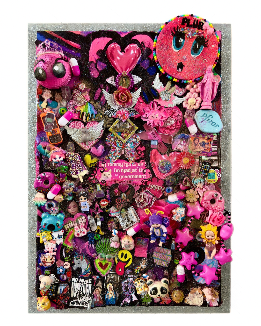 Materials Collected objects, body jewels, homemade stickers, acrylic, gold leaf
