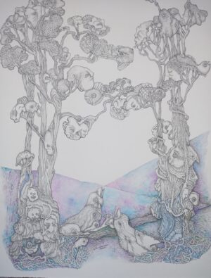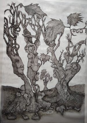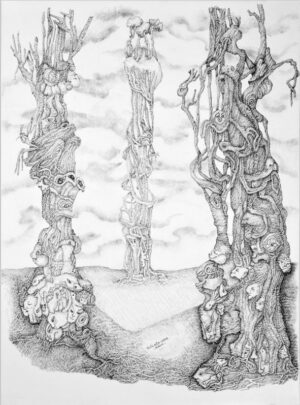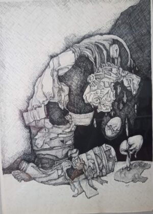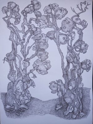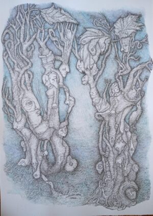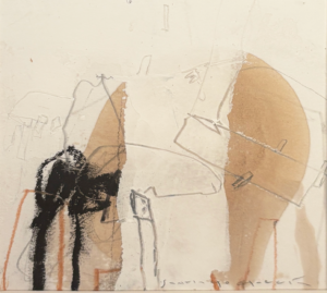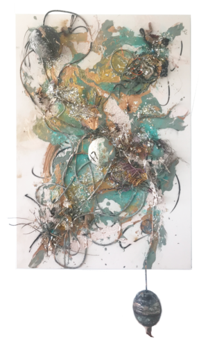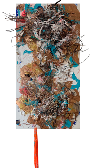 The paintings are structured in a chaotic way, the magic of dynamic abstraction and the almost geometric strokes stimulate the composition while the figures appear in the universal yearning to bring life to the vortex of its maximum intensity.